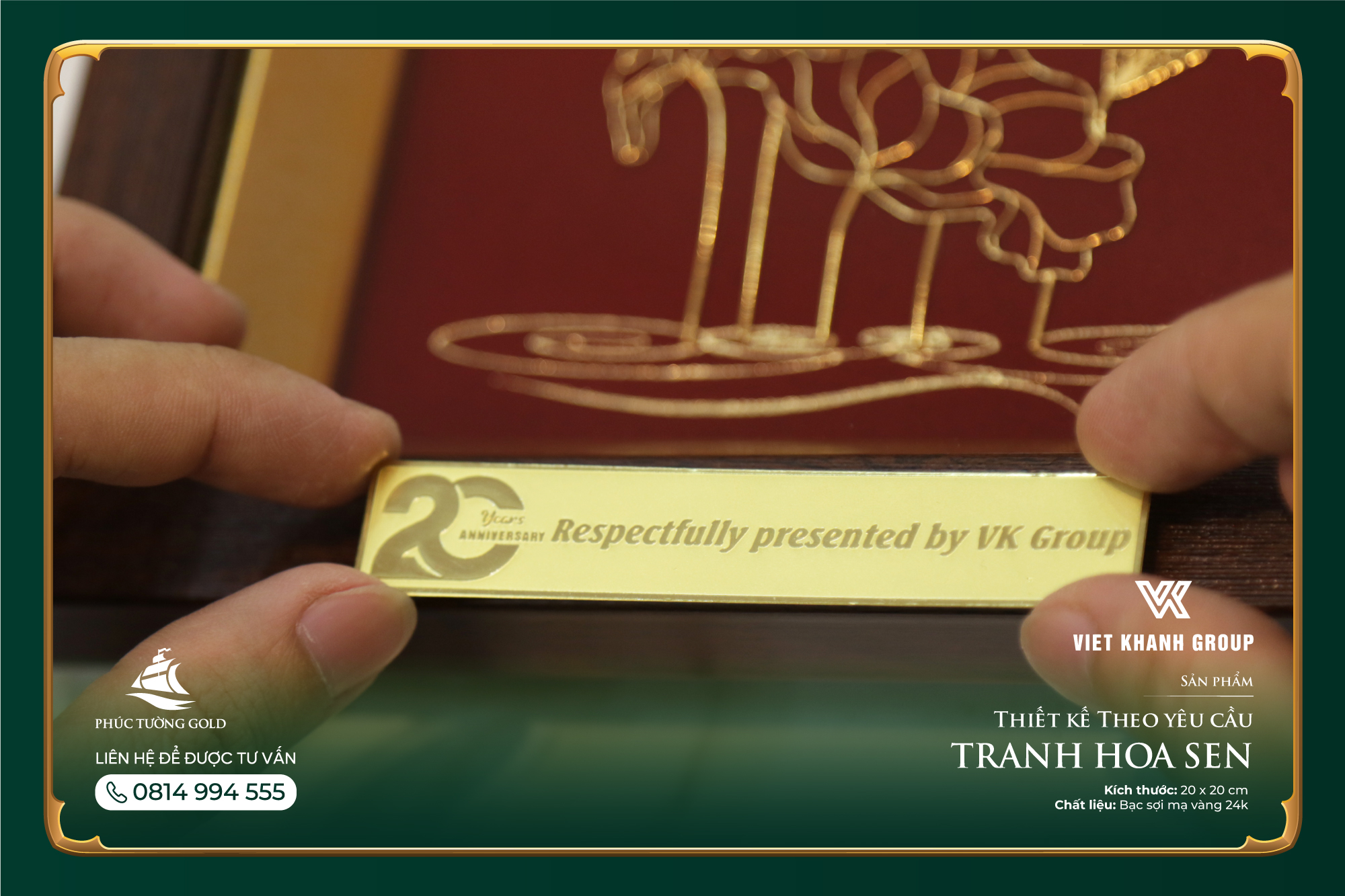 - Lắp Ráp Hoàn Thiện: Tác phẩm sợi bạc mạ vàng được cố định chắc chắn trên nền nhung đỏ, đặt trong khung gỗ tự nhiên kích thước 20×20 cm. Phần đế khung được khắc laser thông điệp kỷ niệm 20 năm của VK Group, hoàn thiện một sản phẩm chỉn chu và đẳng cấp.