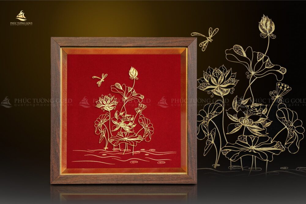 - Sự kết hợp của phú quý và thanh tao: Sự hòa quyện giữa vẻ đẹp tinh khiết của hoa sen và ánh vàng quý giá tạo nên một tác phẩm vừa mang ý nghĩa về sự tôn quý trong phẩm giá, vừa tượng trưng cho sự giàu sang và tài lộc.